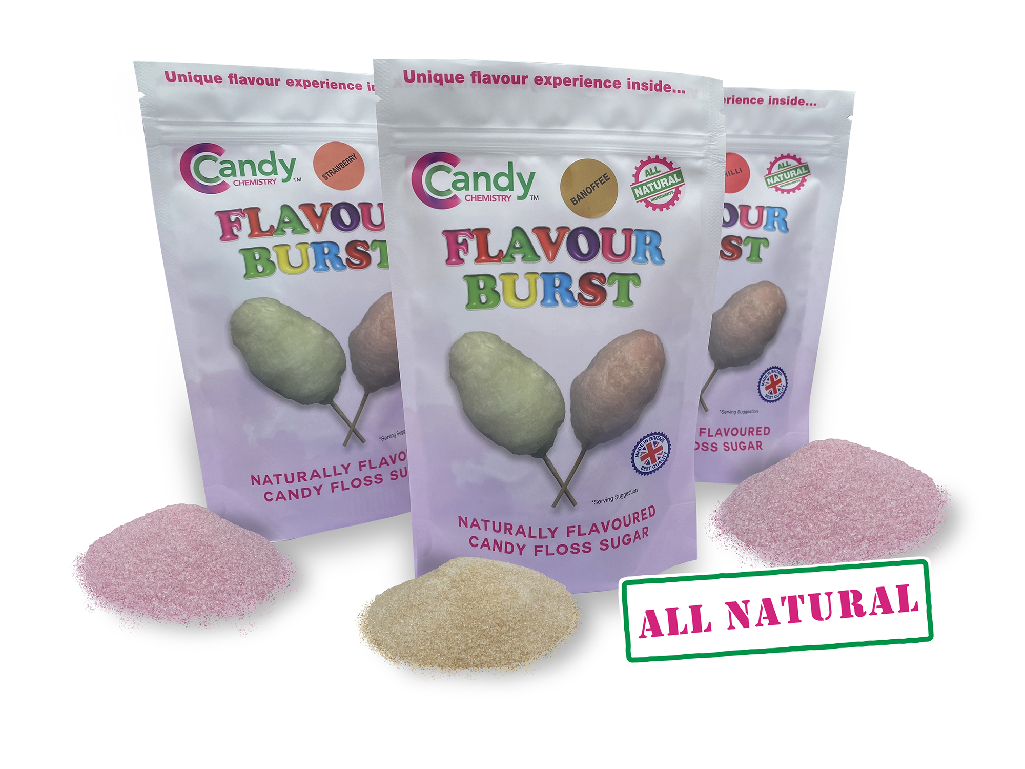 Candy Chemistry Flavour Burst Candy Floss Sugar is a unique product that uses only natural flavourings and naturally derived colourings. Using our very own developed Flavour Burst technology it protects the flavour through the heating process and gives the Candy Floss a complete authentic taste and higher impacting flavour than anything else currently on the market. We also do not use any artificial ingredients or E-numbers whatsoever.