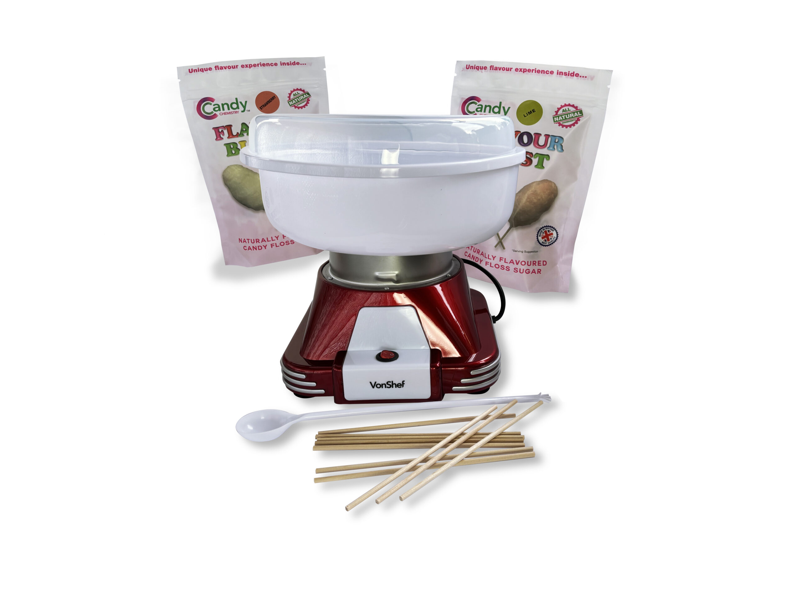 Here we have a VonShef Retro looking Candy Floss Machine which comes along with all you need to instantly start making your own super flavoured candy floss at home.