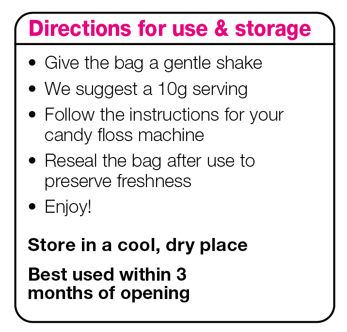 Candy Chemistry Flavour Burst Candy Floss Sugar is a unique product that uses only natural flavourings and naturally derived colourings. Using our very own developed Flavour Burst technology it protects the flavour through the heating process and gives the Candy Floss a complete authentic taste and higher impacting flavour than anything else currently on the market. We also do not use any artificial ingredients or E-numbers whatsoever.