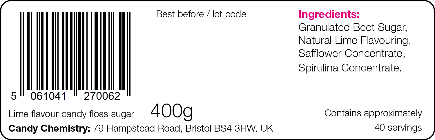 Ingredients: Granulated Beet Sugar, Natural Lime Flavouring, Safflower Concentrate, Spirulina Concentrate