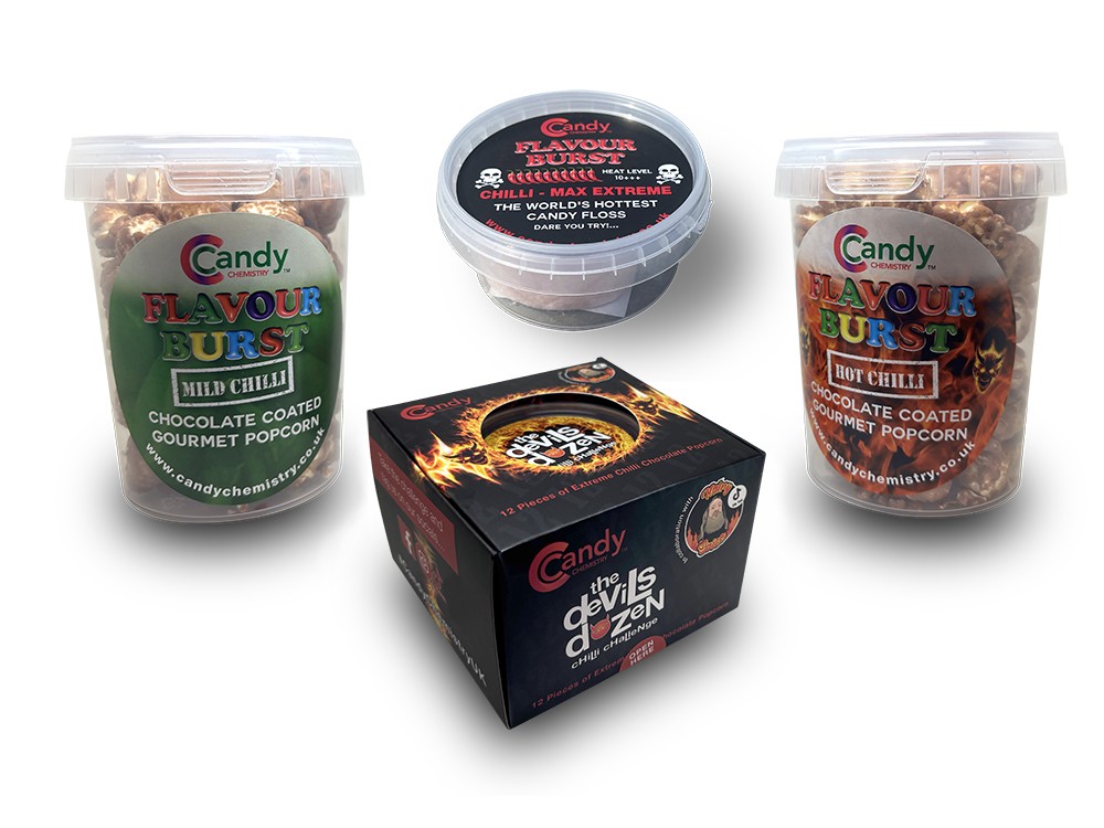 We have produced a MILD, HOT and an EXTREME (Devils Dozen Challenge). Using our own Flavour Burst technology we have infused our microencapsulated Jalapeno Chilli Extract and Hot Chilli Extract into a rich Belgian chocolate, and then hand coated it over Butter Toffee coated popcorn to give it a nice crunch when you bite into it.
